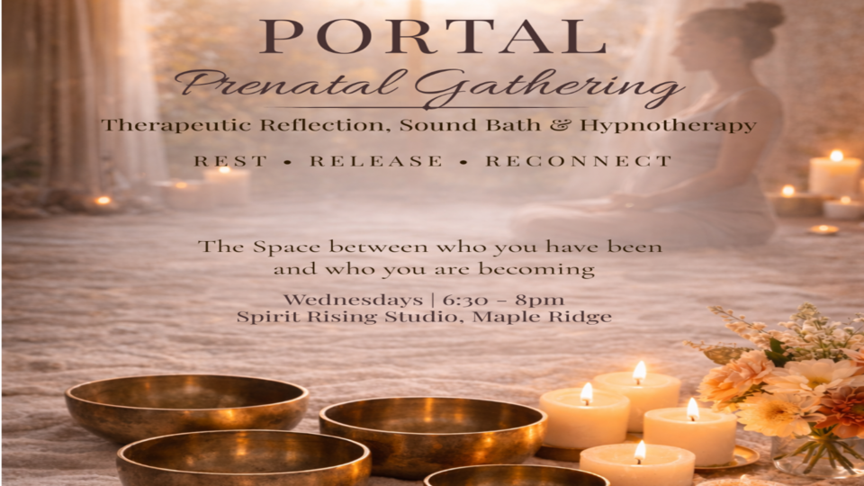 Portal is a prenatal gathering for expectant mothers that weaves together therapeutic reflection, guided hypnotherapy, meditation, and restorative sound baths to support your nervous system, deepen connection with your baby, and prepare emotionally for birth and early motherhood.